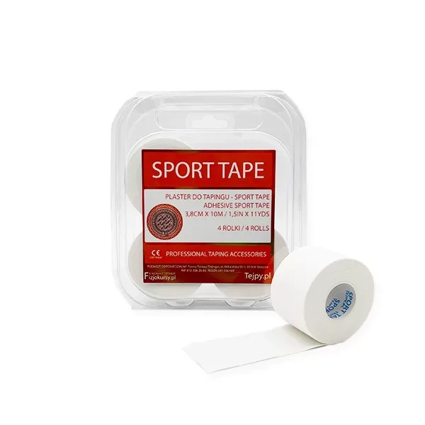 Sport Tape este o bandă rigidă de înaltă calitate, realizată din bumbac 100% impregnat cu zinc, cu adeziv acrilic și hipoalergenic. Aceste benzi sunt rezistente și foarte ușor de aplicat, ceea ce le permite să fie ajustate la nevoile individuale ale pacientului. Dimensiunea de 3,8 cm x 10 m este perfecta pentru lipirea partilor mai mici ale corpului, precum: falange, incheietura mainii, mana sau piciorul. Țeipurile Sport Tape nu provoacă reacții alergice și, în același timp, aderă perfect pe corp - datorită adezivului aplicat longitudinal. Canelurile special concepute absorb transpirația și o elimină în exterior, datorită cărora banda rămâne pe piele pentru o lungă perioadă de timp. Aceste benzi nu se strică și sunt rezistente la întindere, astfel încât pot fi purtate pe piele fără probleme. Pachetul contine 4 role de banda alba.