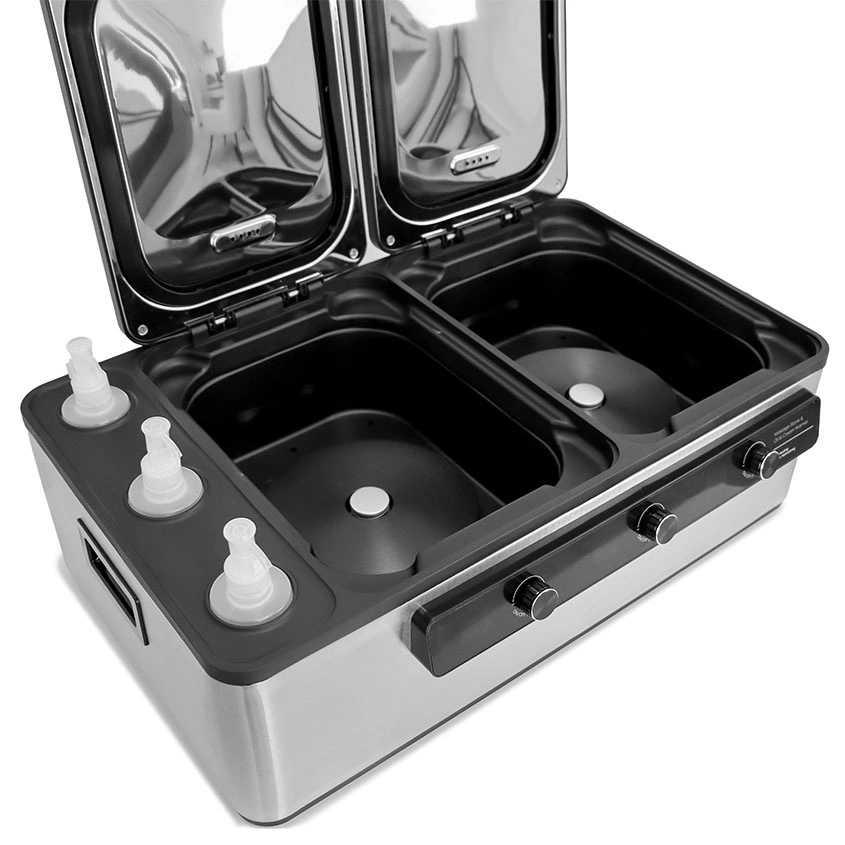 Datorită celor 5 zone de încălzire independente și afișajului LED clar, dispozitivul permite încălzirea simultană și rapidă a 2 recipiente separate cu pietre și 3 sticle.