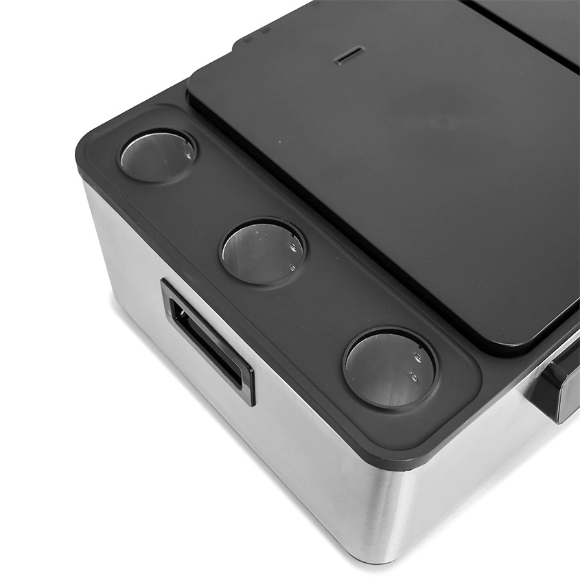 Insertul detașabil simplifică curățarea, iar designul compact cu capac rabatabil economisește spațiu pe masa de lucru.