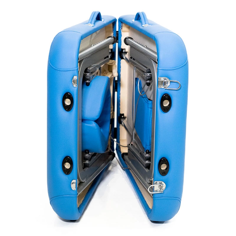 Masa portabilă de masaj este pliabilă (se transformă într-o valiză) și ușor de transportat datorită husei practice. Un mare avantaj este reglarea înălțimii de la 60 la 81 cm – ideală și pentru persoane înalte.Colțurile rotunjite fac masa potrivită pentru terapeuți mobili, chiar și la urcarea scărilor. |
