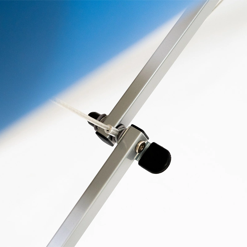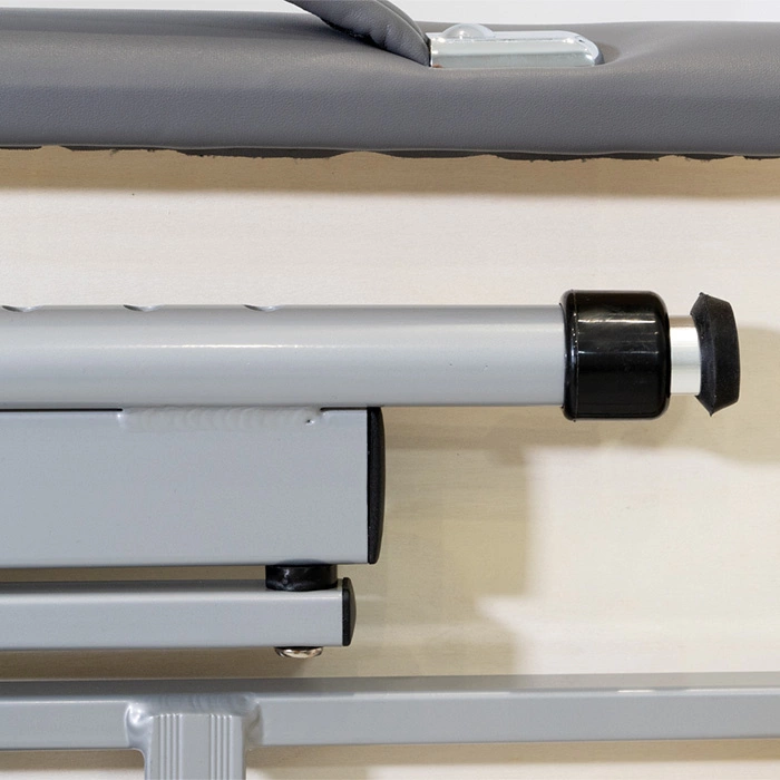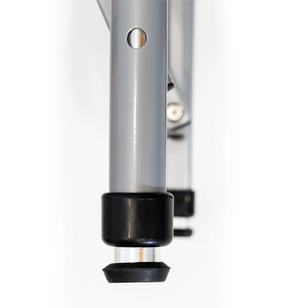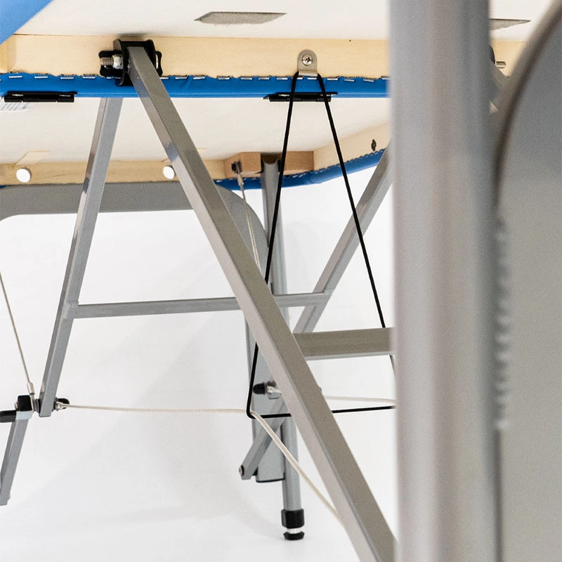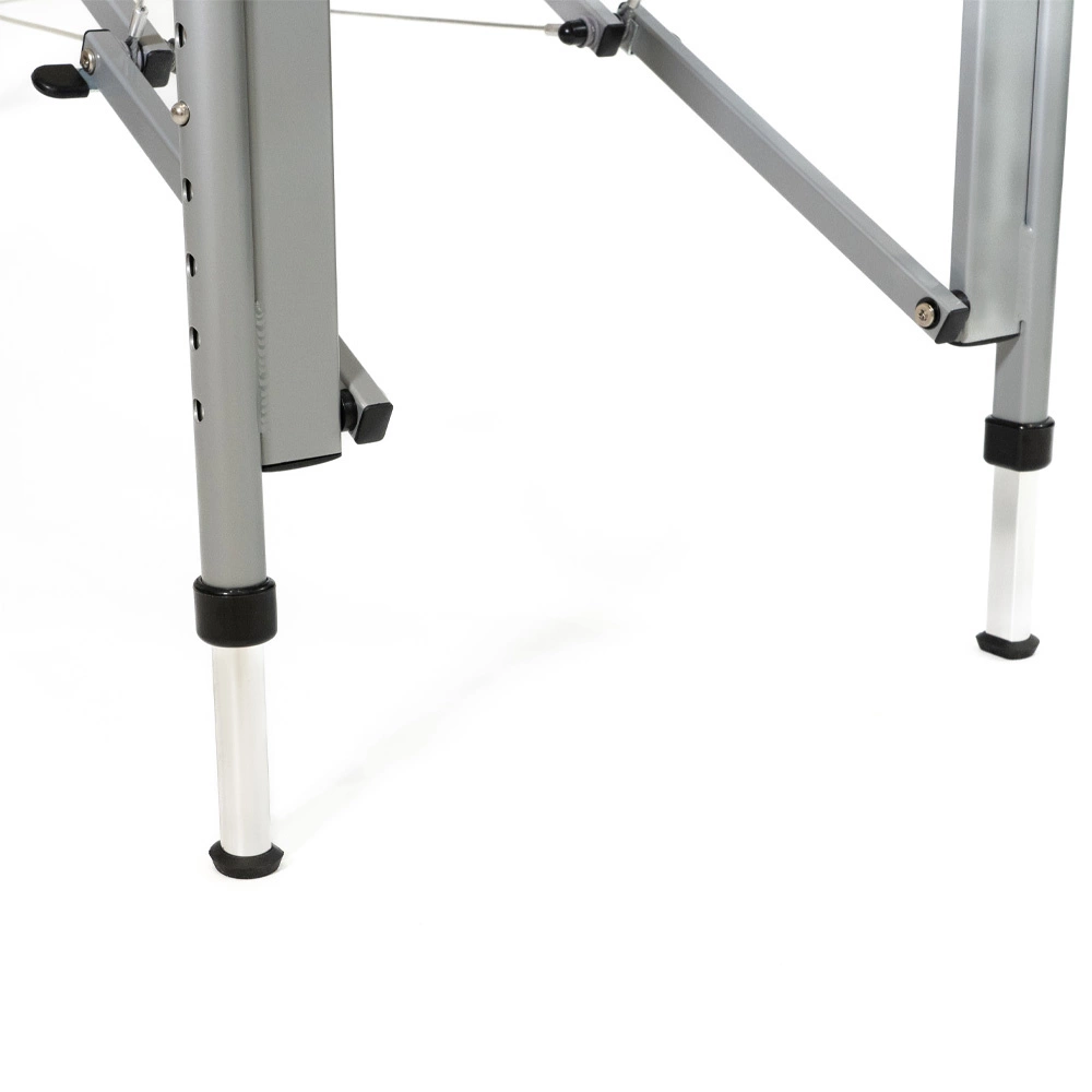 Masa se sprijină pe picioare stabile din aluminiu suplimentar întărite cu profil în formă de „U”. Un element important al acestor picioare este forma „D”, care împiedică rotația piciorului interior, facilitând schimbarea rapidă a înălțimii mesei. Masa este dotată și cu sistemul Fast Lock, care permite reglarea rapidă a înălțimii.Tălpi antiderapante din cauciuc protejează suprafața și împiedică alunecarea mesei. |