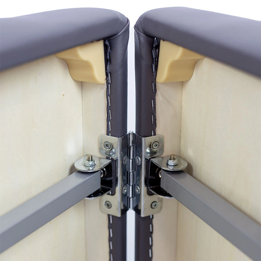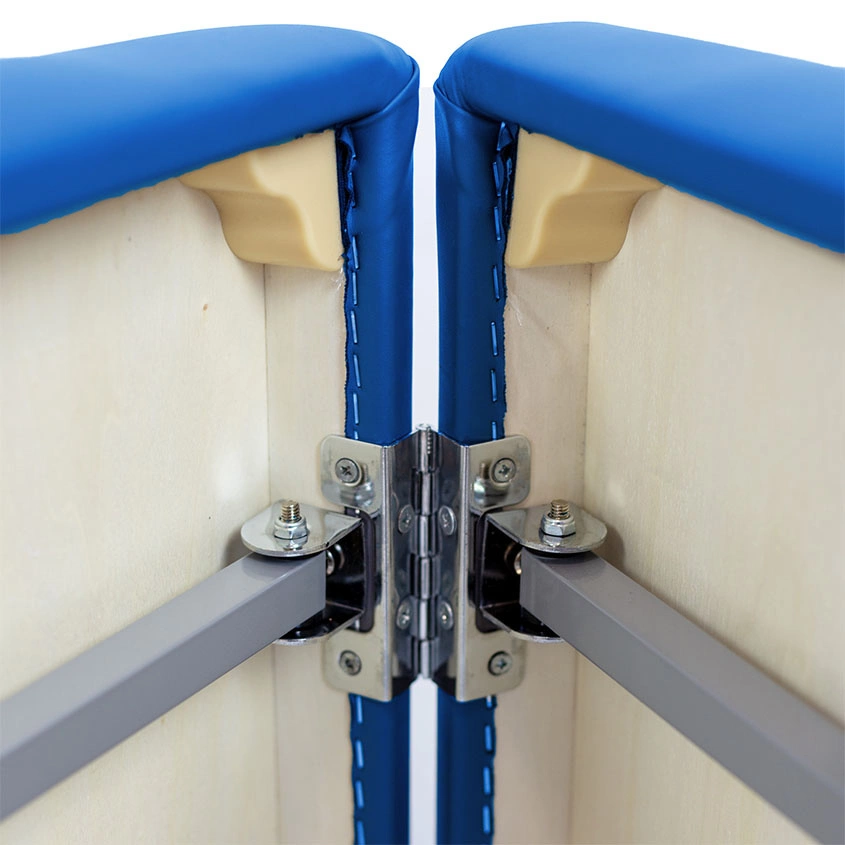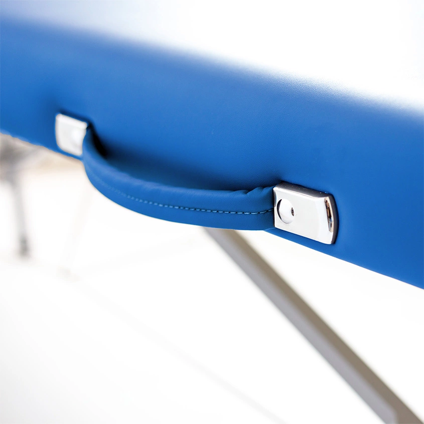 Blatul mesei de masaj este acoperit cu tapițerie rezistentă din PU, moale și plăcută la atingere. Acest lucru oferă un confort ridicat pacientului în timpul terapiei. Materialul PU este durabil, își păstrează culoarea intensă timp îndelungat și este prietenos cu mediul. Tapițeria este rezistentă la abraziune și ușor de curățat.