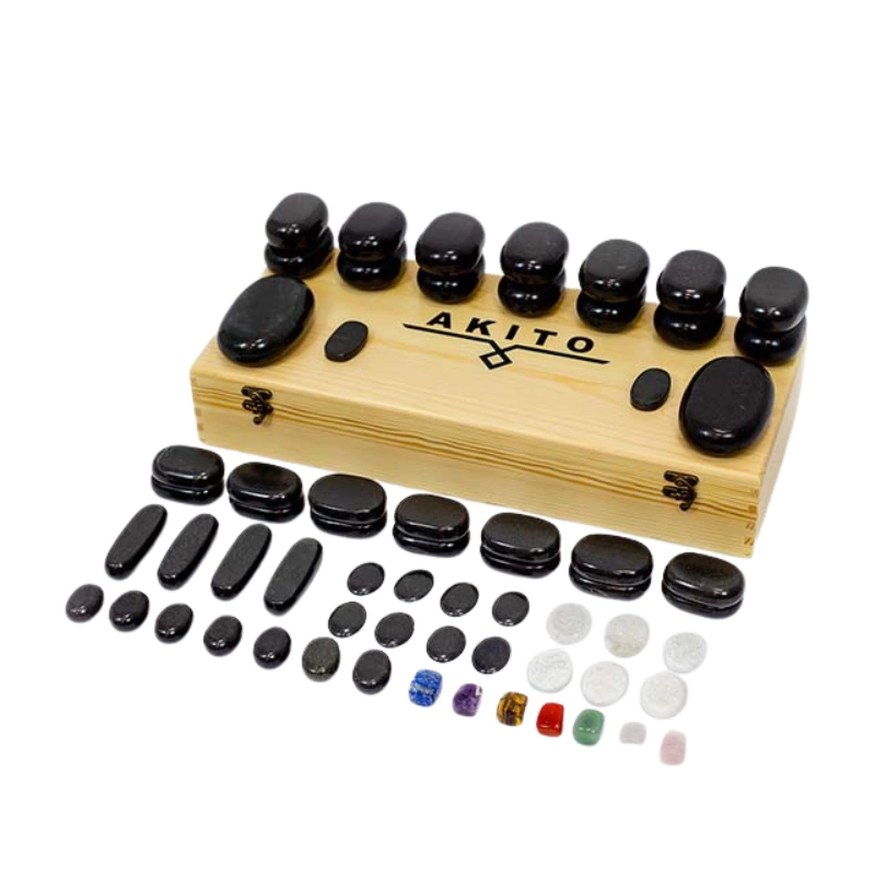 Pietrele bazaltice Akito într-un set de 64 de bucăți sunt plasate într-o valiză din lemn care facilitează depozitarea și menținerea curățeniei în cabinet. În plus, pietrele colorate sunt bogate în minerale și pot fi plasate pe diferite părți ale corpului.